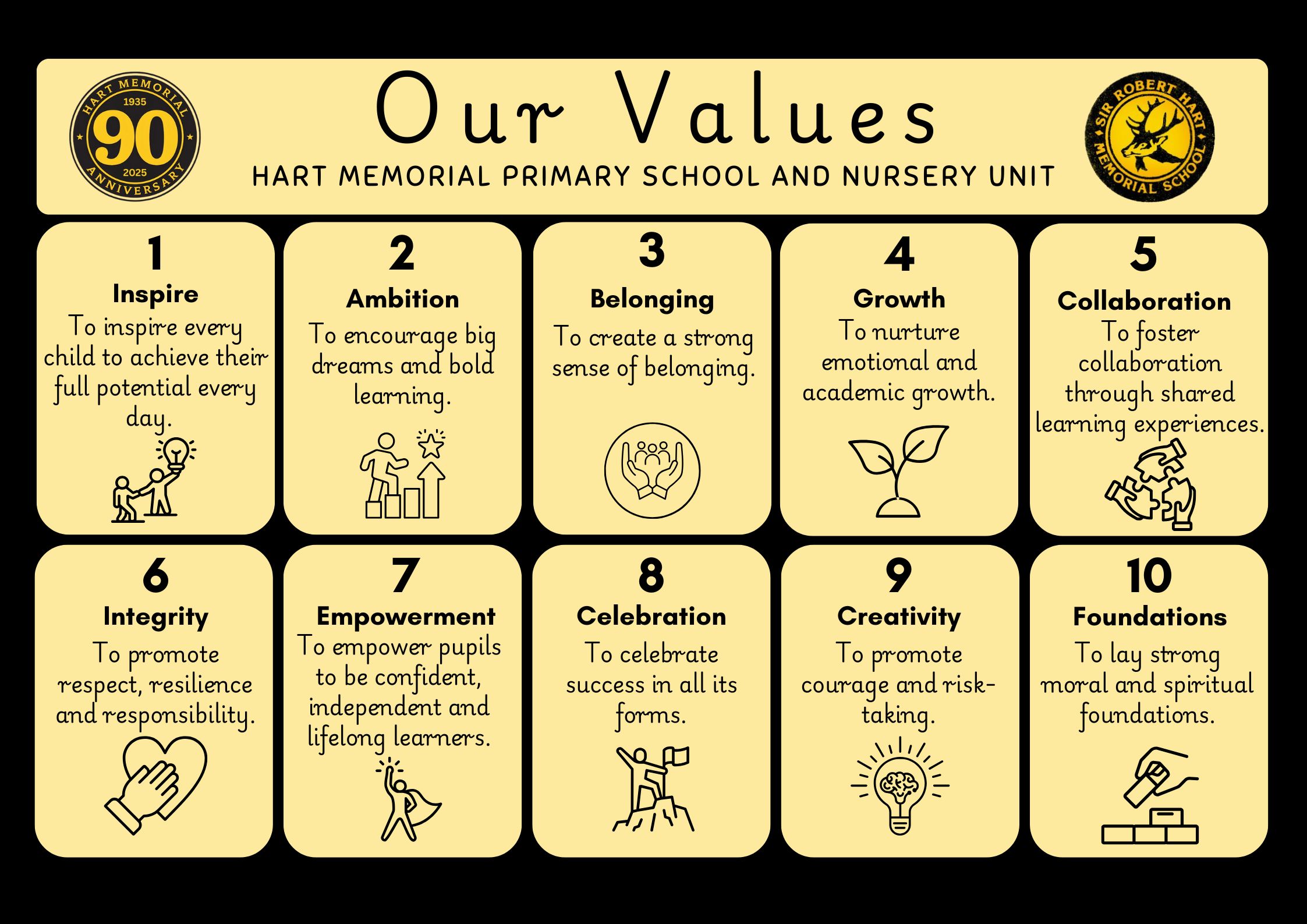 At Hart Memorial, our vision is to continue to develop a vibrant, inclusive learning community where every child feels safe, valued, and inspired to achieve their full potential. Building on our strong foundations, we hope to constantly challenge our pupils to be the best that they can be. With a renewed focus on pupil health and wellbeing, alongside personal, academic and spiritual growth, we hope to continue to develop our pupils in a holistic manner.